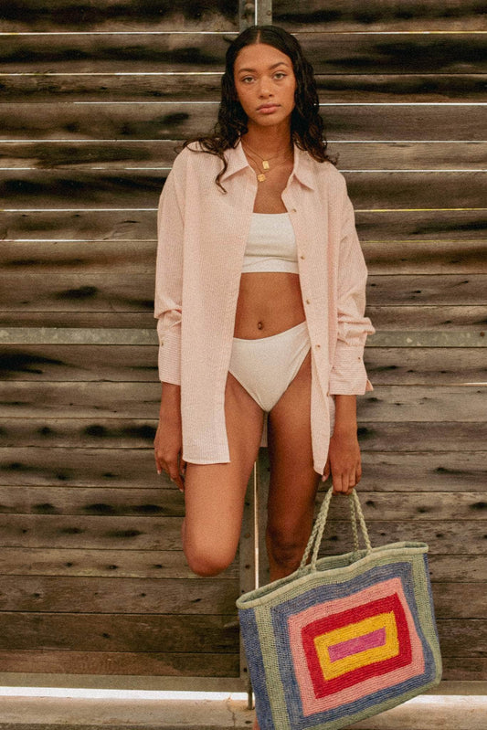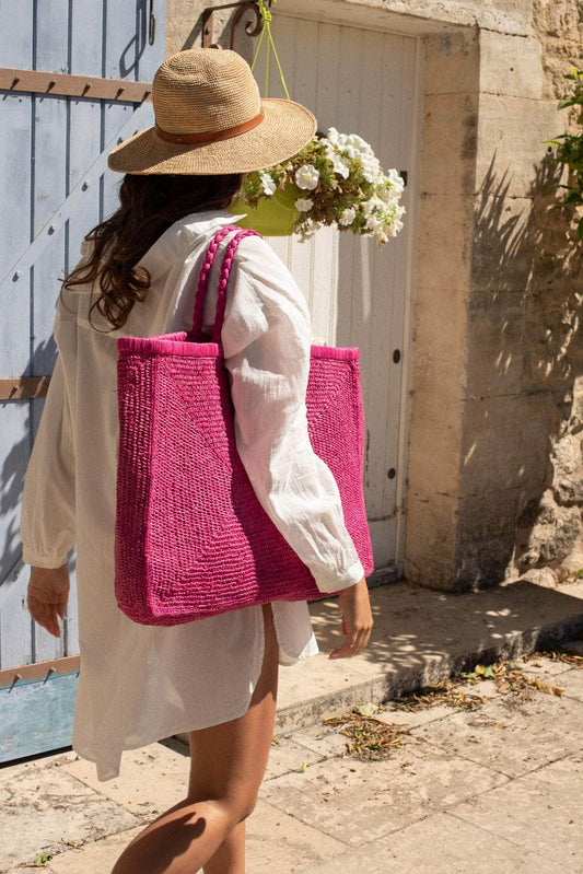 Panier en raphia naturel à rayures jaune Chloé - grand modèle
